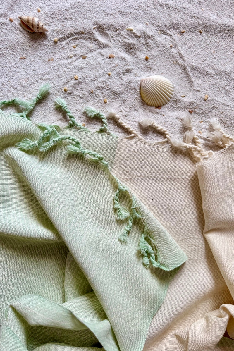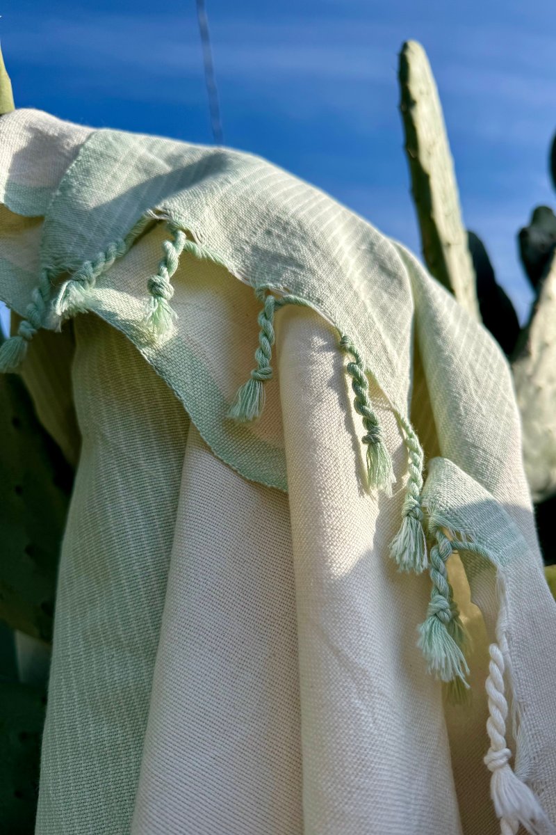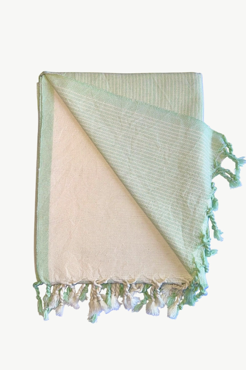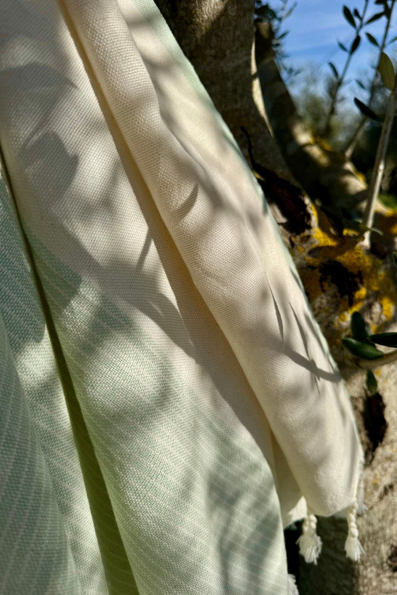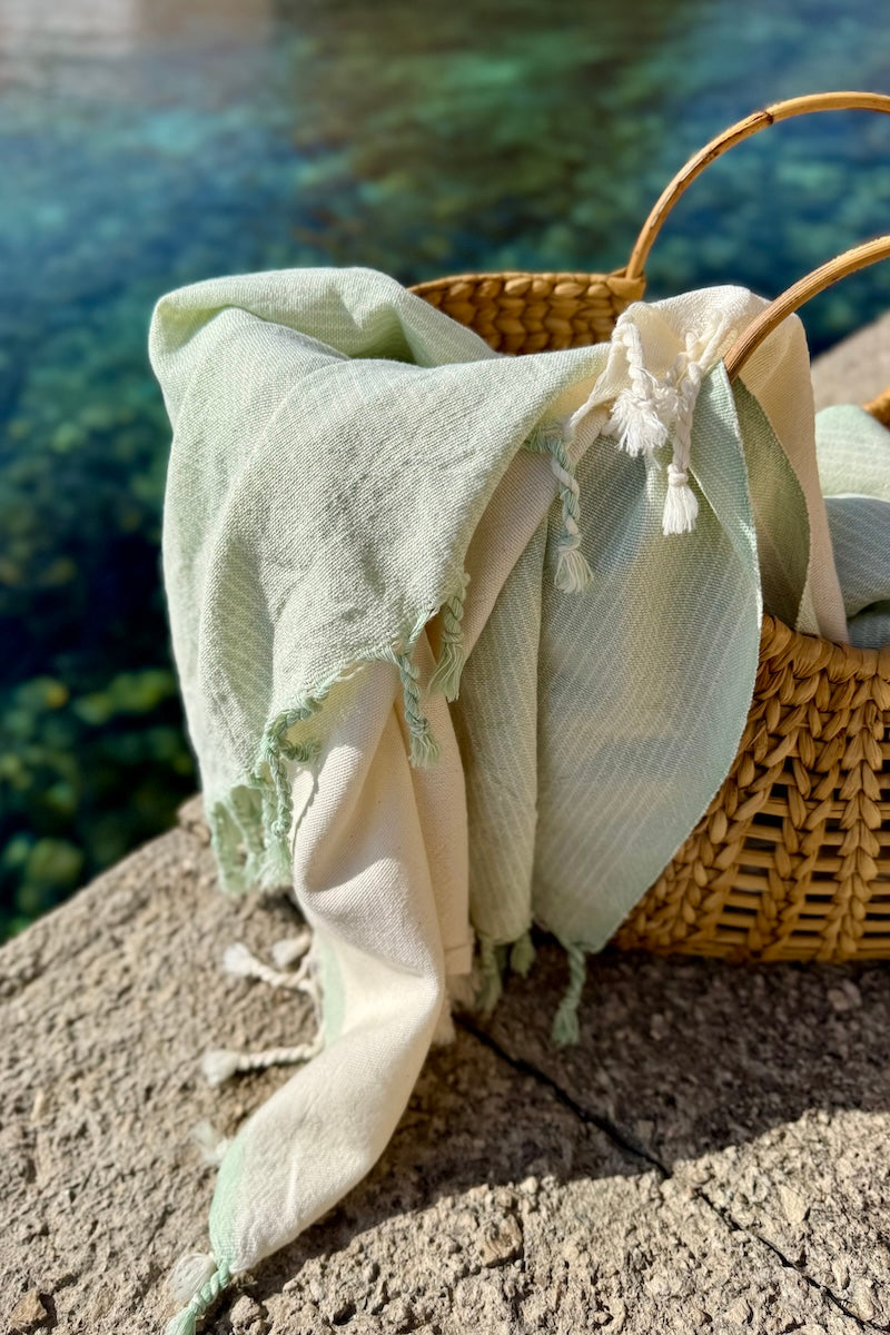 The dusting of salt carried by sea spray, left behind by the waves — this is the meaning of alisachne in Greek. Our latest style of peştemal has a subtle pattern of soft green stripes on a white or blue weft. Handwoven from cotton on traditional looms in the ancient city of Antakya.