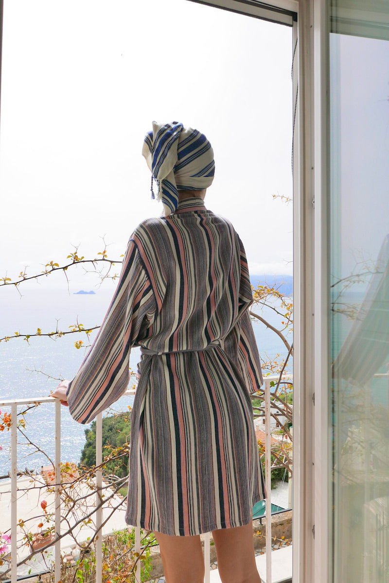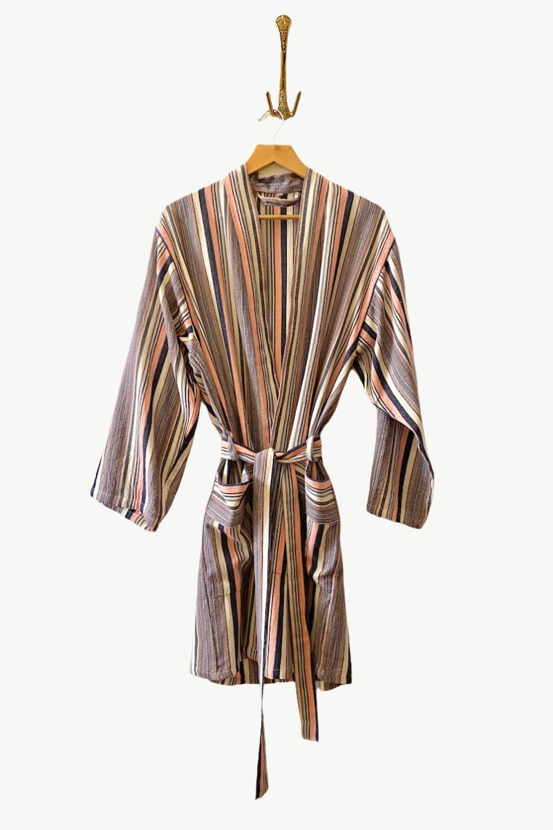 The Bahar towel and matching robe are handwoven by artisans in Antakya in vivid shades of pink and blue. Available in sizes S and M.