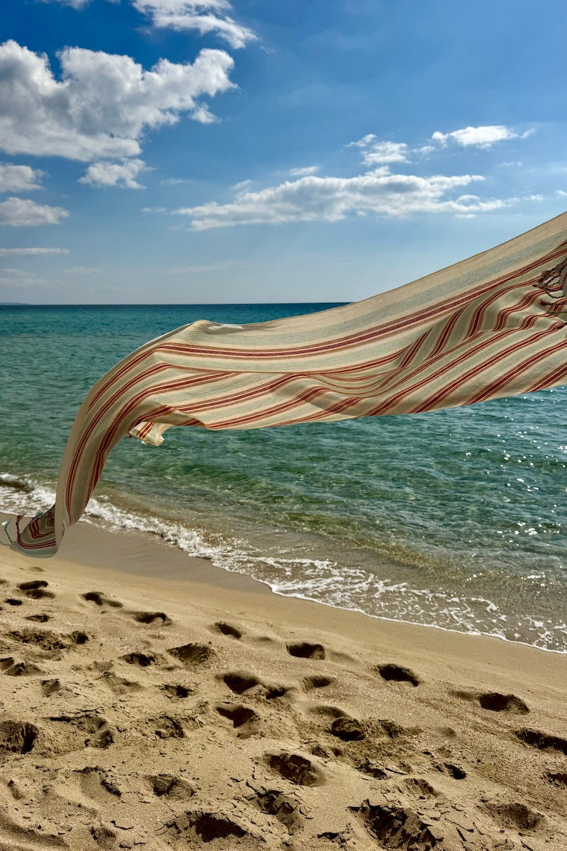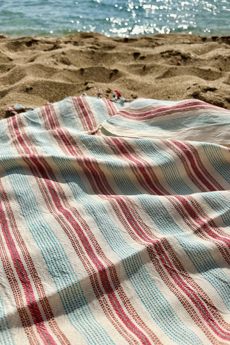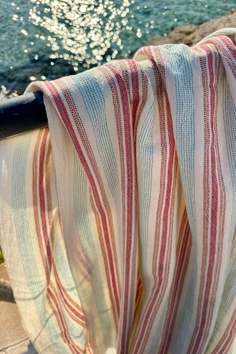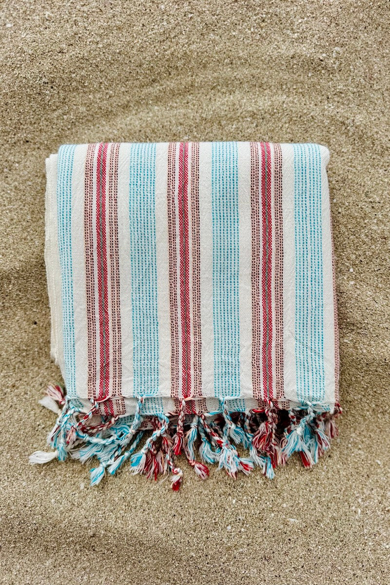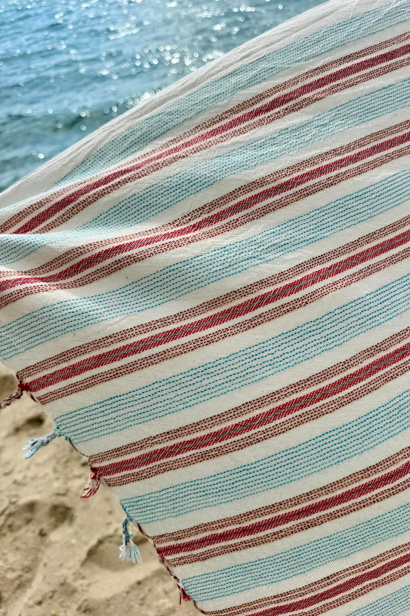The Hazan is part of our small-batch drop for autumn, handwoven from cotton in turquoise and terracotta stripes.