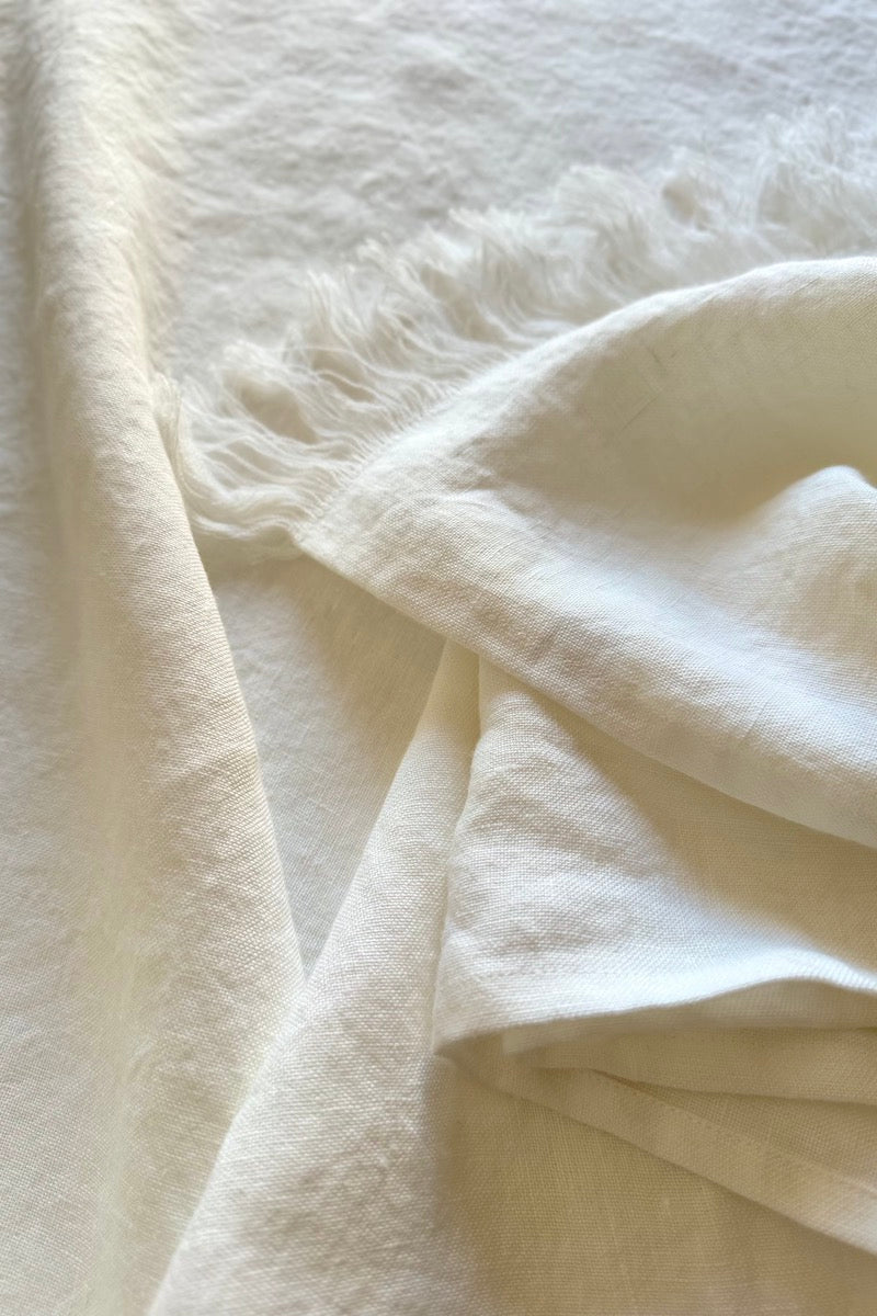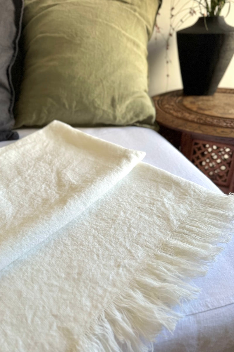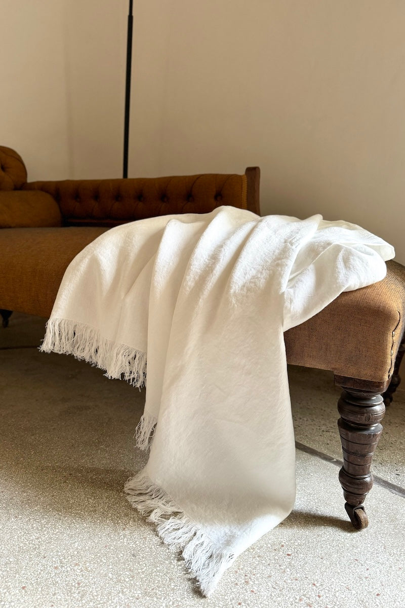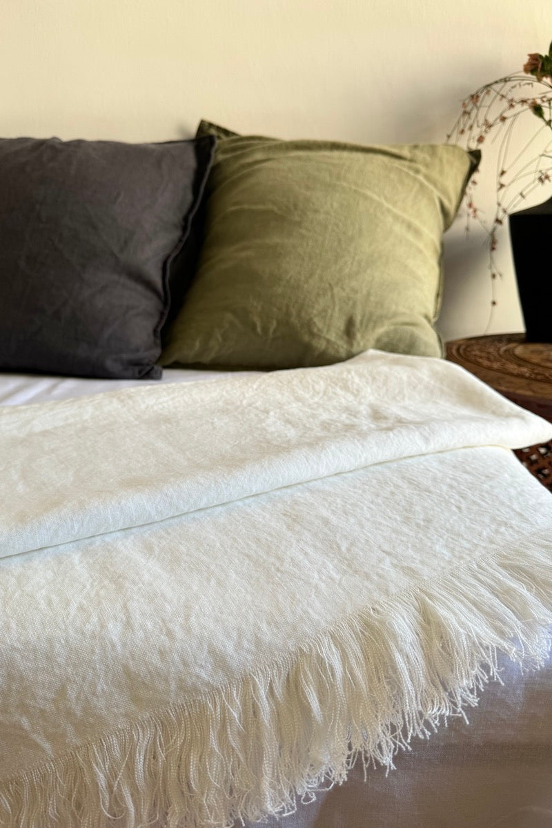 Linen is the essential fabric of Mediterranean minimalist decor. Natural, breathable, and durable, it is forever elegant and suitable for all seasons. The Pia throw is handmade from stonewashed Italian linen with fringes on two sides.