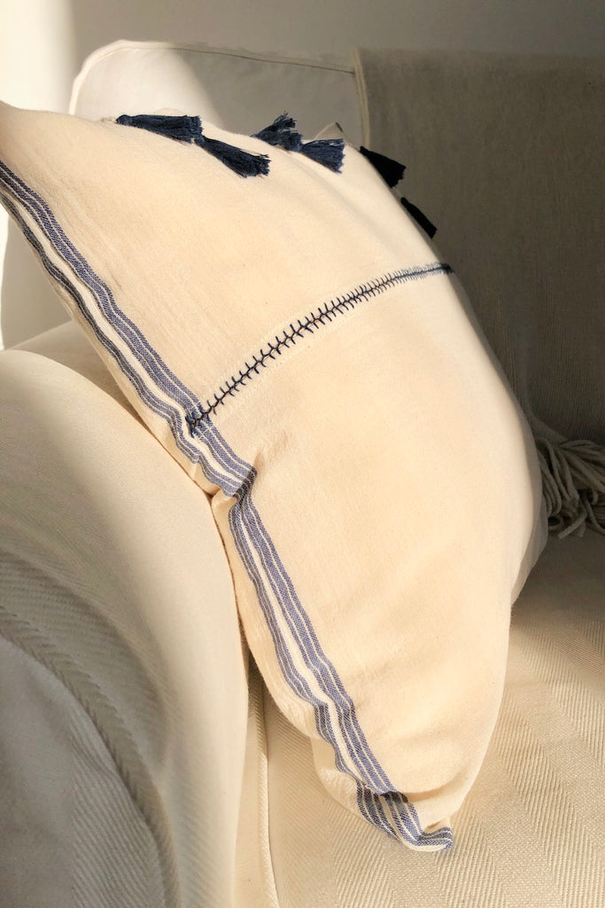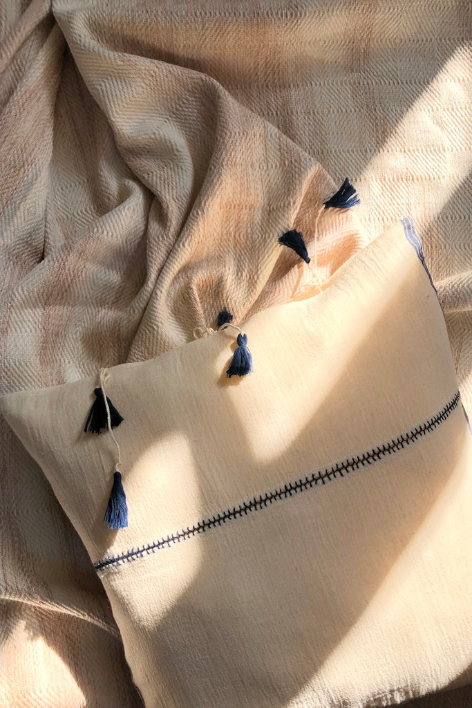 Our Şile bezi pillows are created by a cooperative of women in a multi-step process that begins with spinning GOTS certified organic cotton fibers 1200 times to make thread. The handloomed cotton fabric is then boiled in floured water, washed in seawater and dried on the quartz sand beaches of the Black Sea. Finally, the stitching and crochet details of the pillowcases are likewise done by hand.