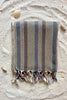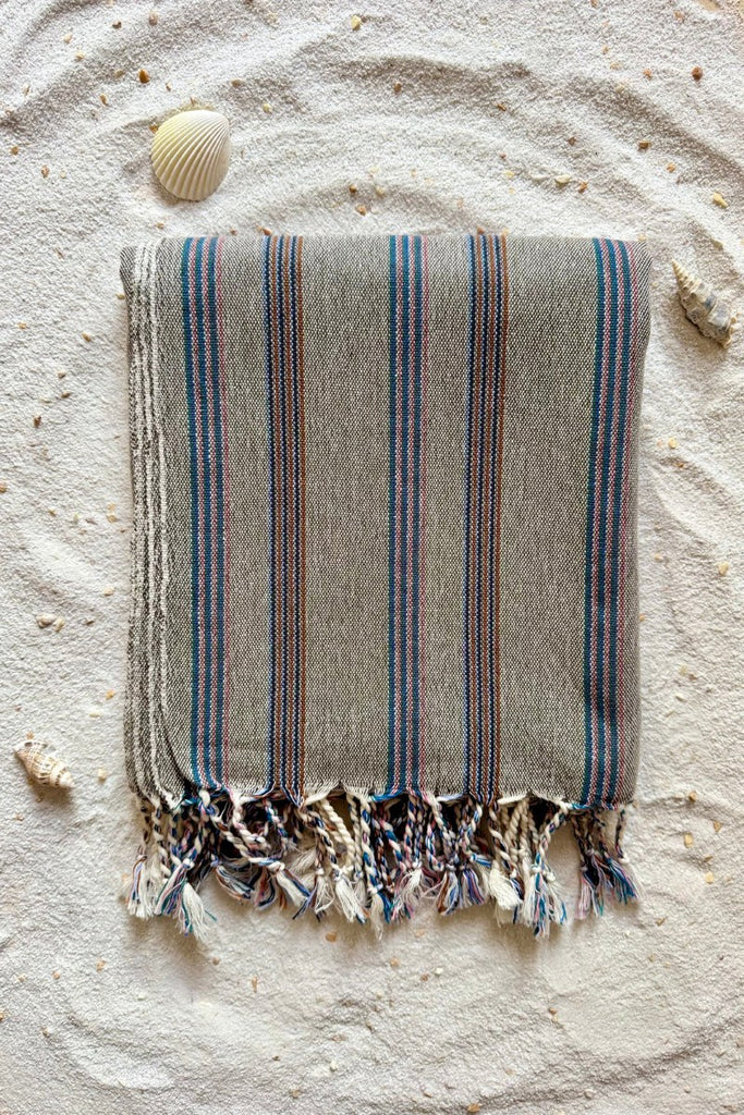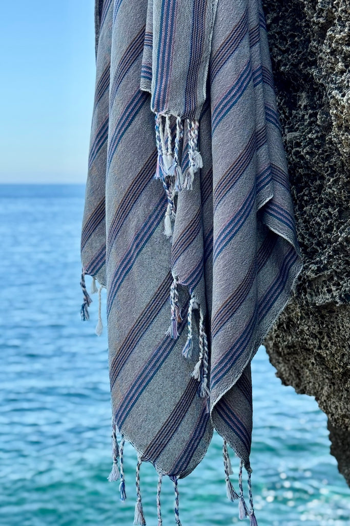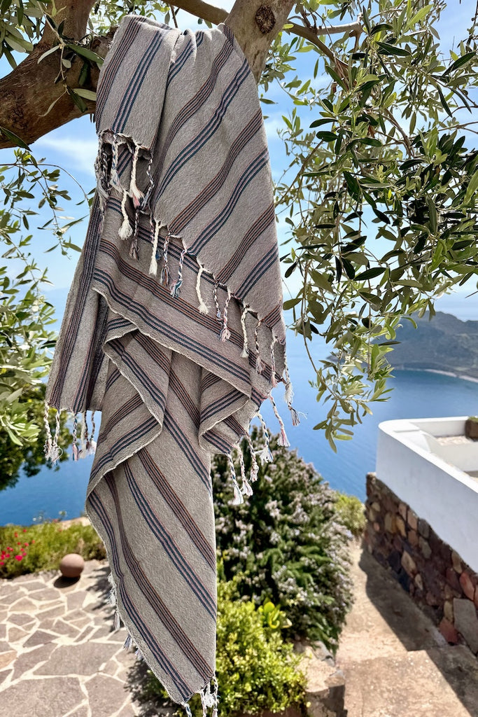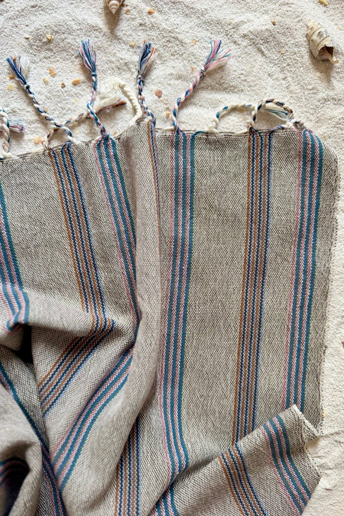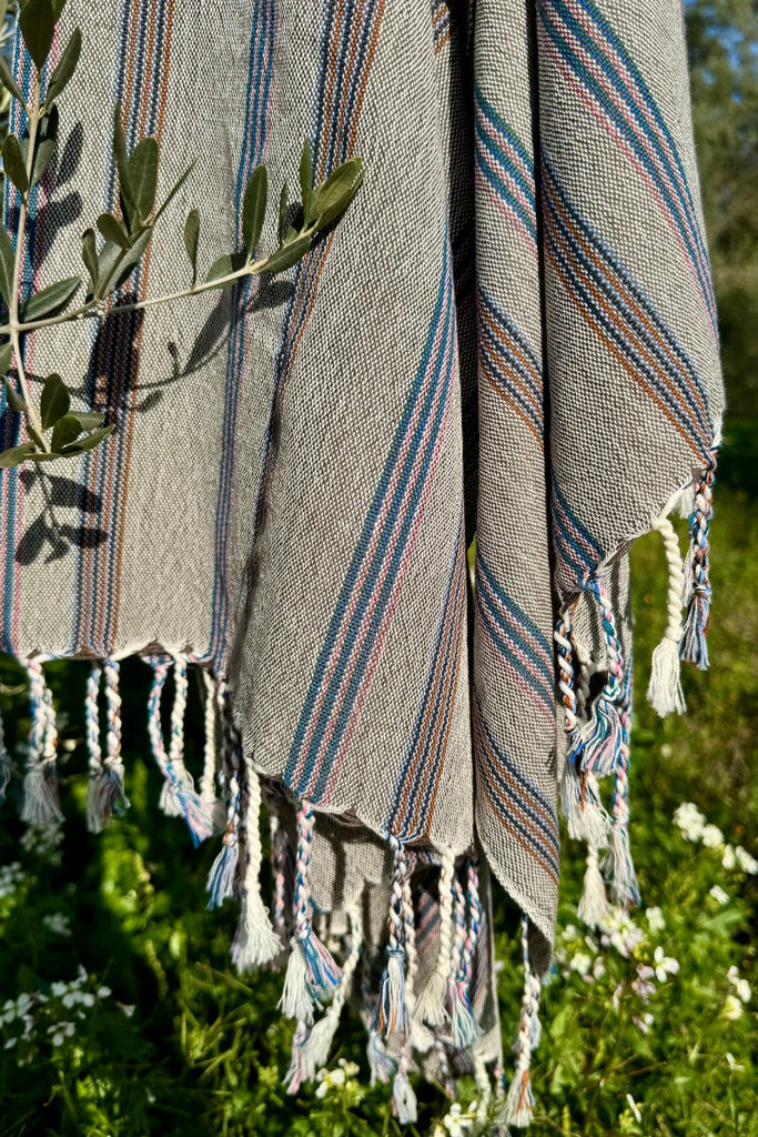 Zephyros was the Greek god of the west wind, who brought spring on gentle breezes. Our Zephyr towel is handwoven from supple lightweight cotton with a stripes in spring tones on a white or khaki weft.